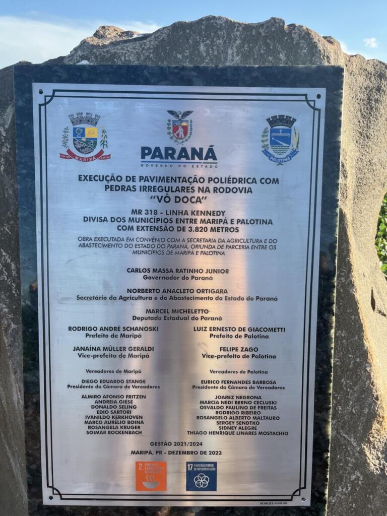 A rodovia municipal MR 318, localizada no limite entre os municípios de Maripá e Palotina, recebeu a pavimentação poliédrica com pedras irregulares em uma extensão de 3.820 metros e recentemente foi nomeada como Rodovia Vô Doca. A inauguração ocorreu na tarde desta sexta-feira (1º) com a presença dos prefeitos de Maripá Rodrigo Schanoski e de Palotina Luiz Ernesto de Giacometti, do deputado estadual Marcel Micheletto, vereadores e moradores da localidade.