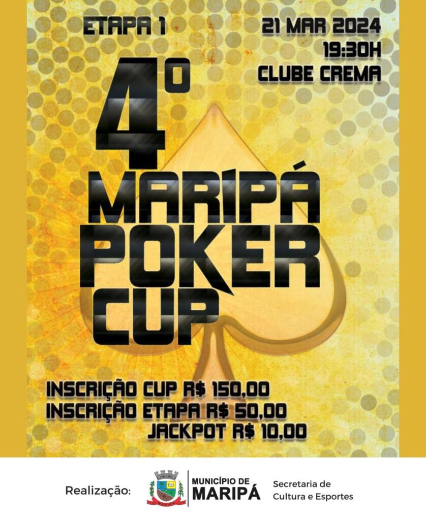 Em sua 4ª edição, o Maripá Poker Cup está com inscrições abertas até 21 de março, data em que ocorre a primeira etapa, às 19h30, no Clube Crema. Ao todo, serão oito etapas classificatórias durante o ano. Podem se inscrever maiores de 18 anos que tenham vínculo com o município.