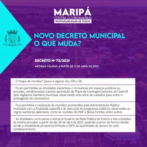 O governo municipal de Maripá publicou na tarde de sexta-feira (16) o Decreto 72/2021, que altera medidas relacionas ao enfrentamento da Covid-19. As alterações foram propostas e aprovadas em reunião do Comitê Gestor Municipal do Plano de Contingenciamento em Saúde da Covid-19, realizada na quinta-feira (15).
