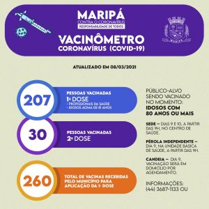 Com o último lote, Maripá totaliza 260 doses recebidas para aplicação da 1ª dose, 170 da Coronavac/Butantan e 90 da Astrazeneca/Fiocruz. O Município vacinou até o momento 207 pessoas – entre profissionais de saúde e idosos – com a primeira dose e 30 pessoas com a segunda dose da vacina.