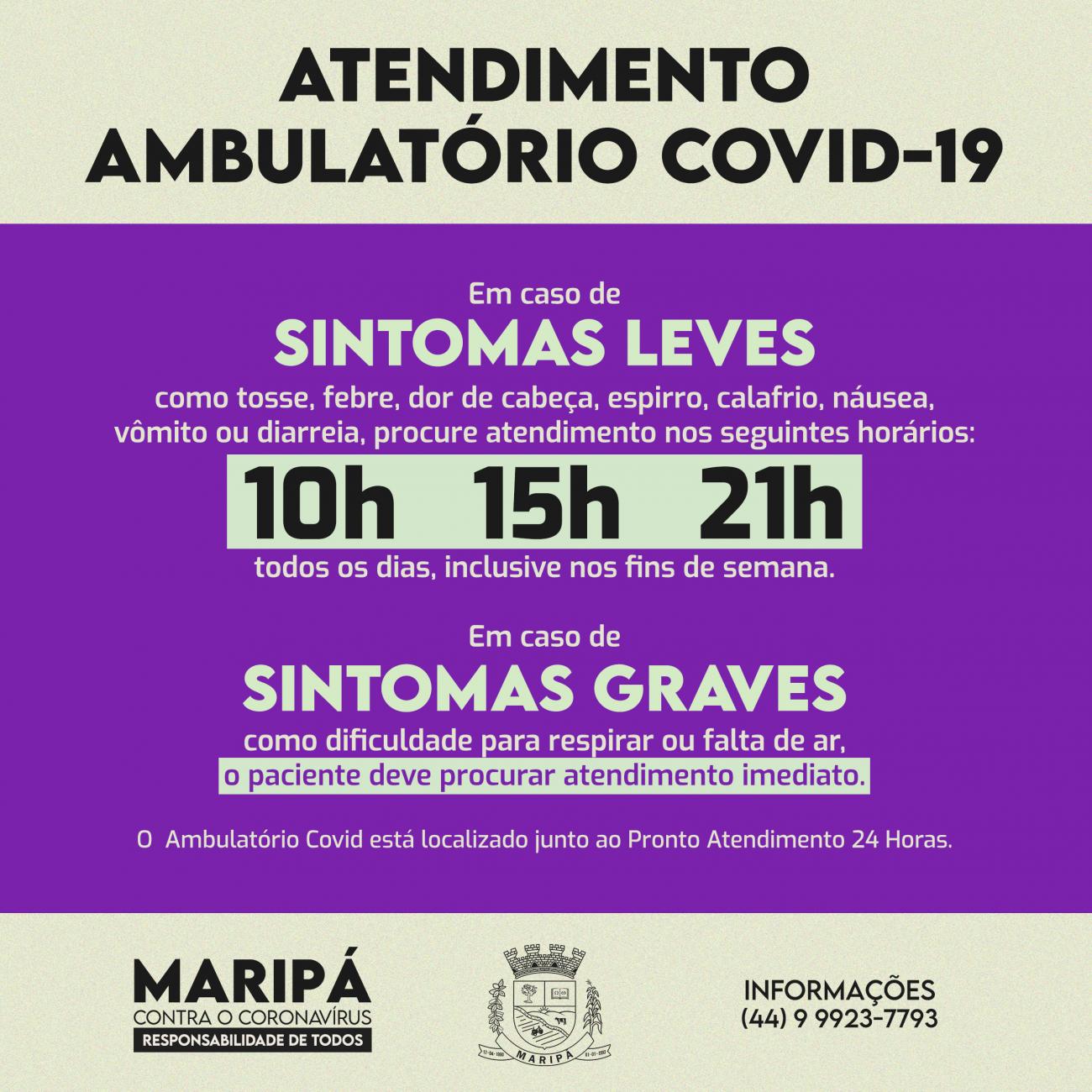 Os pacientes que apresentam sintomas mais leves como tosse, febre, dor de cabeça, espirro, calafrio, náusea, vômito ou diarreia devem procurar o atendimento nos horários das 10h, 15h ou 21h, todos os dias, inclusive nos fins de semana.