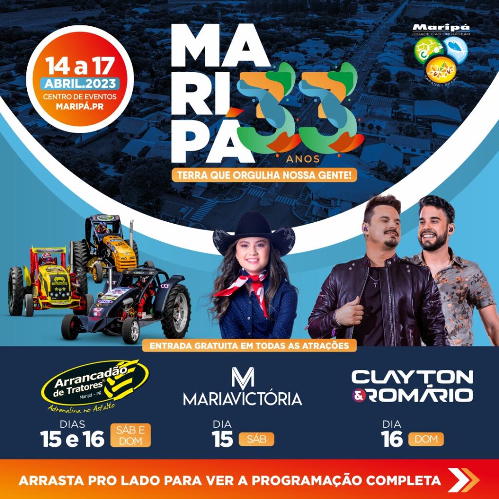 O Município de Maripá completa 33 anos de Emancipação Político-Administrativa no dia 17 de abril. Para comemorar o aniversário da cidade, o governo municipal de Maripá está preparando uma grande festa para a comunidade local e regional. A entrada é gratuita para prestigiar as atrações.