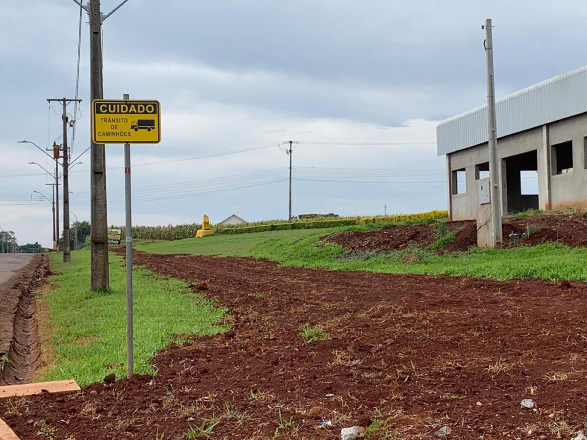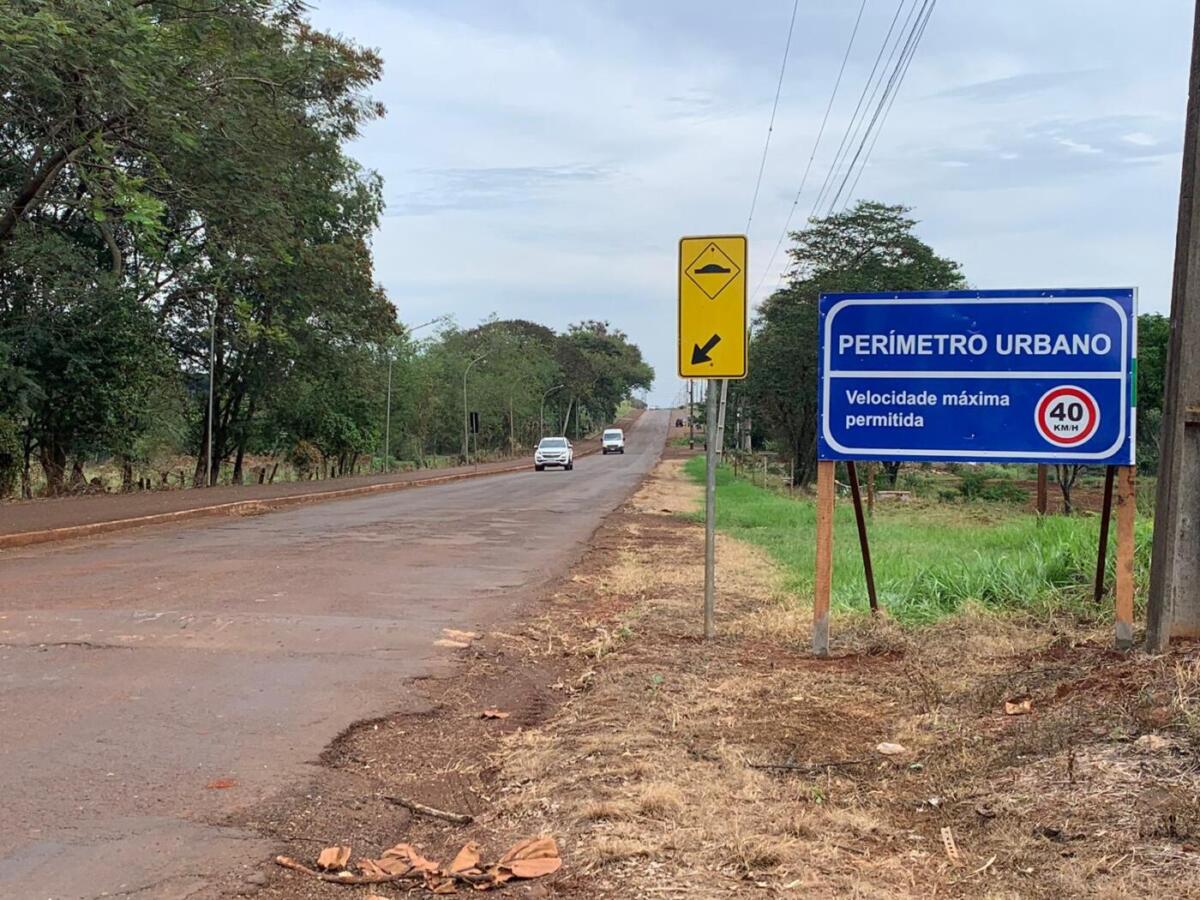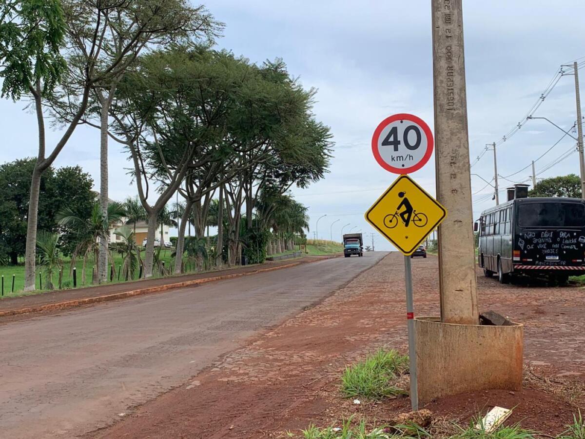 A principal sinalização está relacionada a velocidade dos motoristas. As placas, indicam que a região é de entrada e saída de caminhões e perímetro urbano. Assim, o limite de velocidade é de 40 quilômetros por hora.