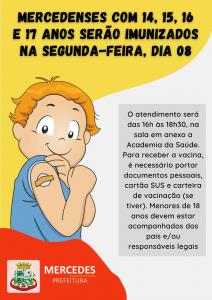 A Secretaria de Saúde de Mercedes dará sequência ao cronograma de imunização contra a Covid-19. Nesta segunda-feira (08), serão imunizadas pessoas com 14, 15, 16 e 17 anos, além de mercedenses de 12 a 17 anos com comorbidades. O atendimento será das 16 horas às 18h30, na sala em anexo a Academia da Saúde, localizada ao lado do CRAS.