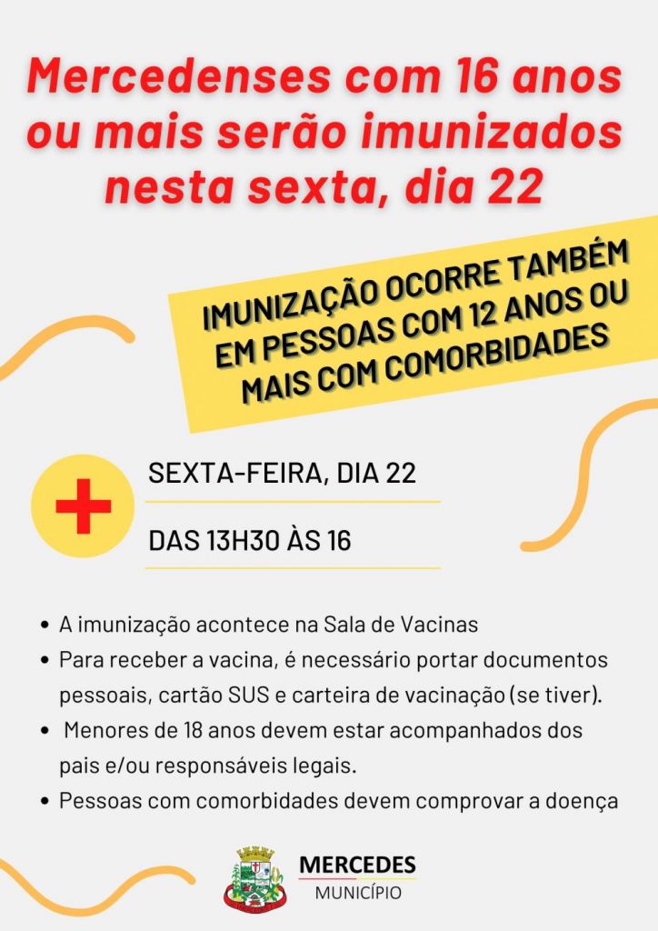 A Secretaria de Saúde de Mercedes dará sequência ao cronograma de imunização contra a Covid-19. Nesta sexta-feira (22), serão imunizados adolescentes com 16 e 17 anos sem comorbidades, além de mercedenses de 12 a 17 anos com comorbidades. O atendimento será das 13h30 às 16 horas, na sala em anexo a Academia da Saúde, localizada ao lado do Centro de Referência de Assistência Social (Cras).