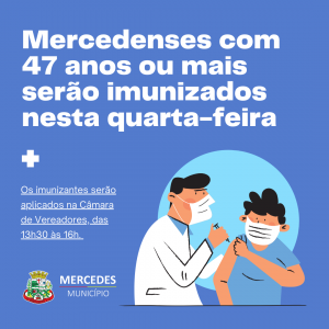 A Secretaria de Saúde de Mercedes dará sequência nesta quarta-feira (07) ao cronograma de vacinação contra a Covid-19. Mercedenses com 47 anos ou mais serão imunizados. Também haverá continuidade da vacinação para pessoas que tenham alguma comorbidade ou deficiência permanente, com idade superior a 18 anos.