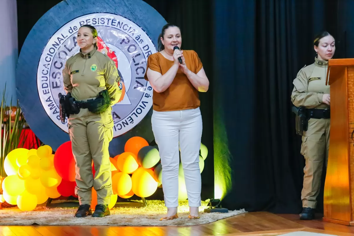 A instrutora do Proerd, soldado Joselaine Oliveira, recebeu homenagem dos formandos, que agradeceram pelo acompanhamento nas escolas e pelo trabalho de orientação desenvolvido ao longo das atividades.