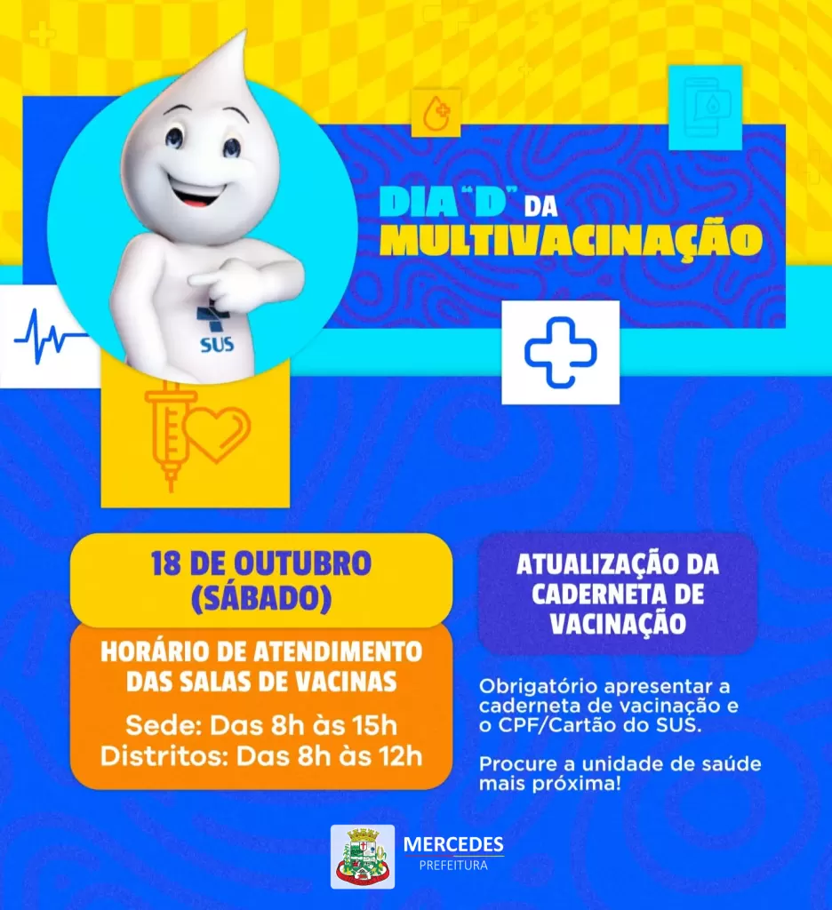 A Secretaria de Saúde de Mercedes realiza neste sábado (18) o Dia “D” da Campanha de Multivacinação 2025, com o objetivo de mobilizar pais e responsáveis a levarem crianças e adolescentes menores de 15 anos às salas de vacina do município.