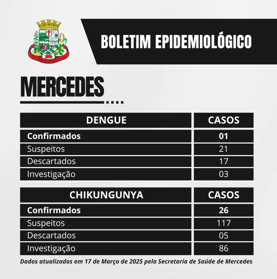 O novo boletim da Secretaria de Saúde de Mercedes, divulgado nesta segunda-feira (17), confirma 26 casos de febre Chikungunya e um caso de dengue no Município. Em relação à semana anterior, houve um aumento de sete casos. Além disso, estão em investigação 86 casos de Chikungunya e três de dengue.
