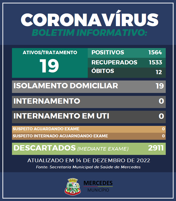 Nesta quarta-feira (14), Mercedes possui 19 casos ativos, sendo que todos estão em isolamento domiciliar.