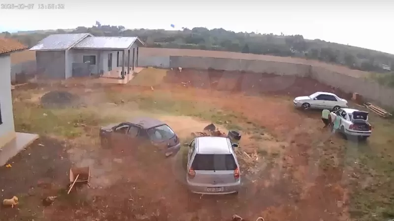 Nas imagens, duas pessoas aparecem no terreno, e tentam se esconder perto de veículos, quando uma rajada intensa atinge o imóvel e lança completamente a cobertura ao chão. Toda a ação dura menos de 10 segundos.