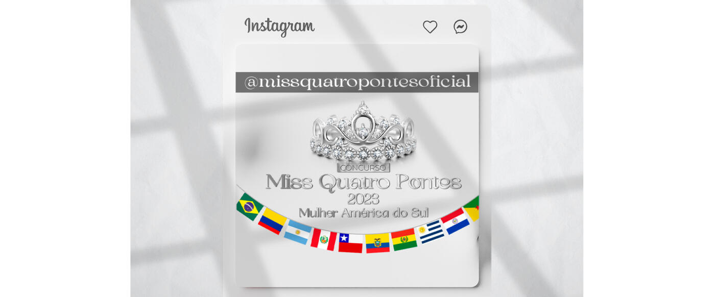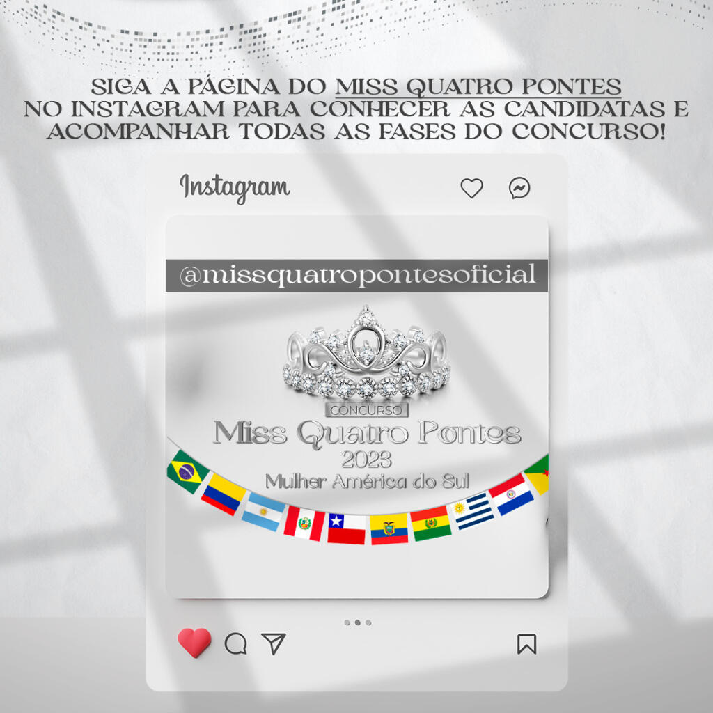 Além de conferir tudo na página oficial da Prefeitura de Quatro Pontes e da Secretaria de Cultura e Esportes no Facebook, agora os internautas também podem acompanhar todas as fases do Miss Quatro Pontes 2023 – Mulher América do Sul e as suas candidatas na página oficial no Instagram, acessando @missquatropontesoficial.