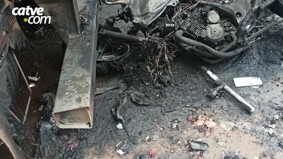 Com a força do impacto, a moto explodiu e ficou em chamas. O Corpo de Bombeiros esteve no local com a viatura de combate a incêndio e, em ação rápida, controlou o fogo.