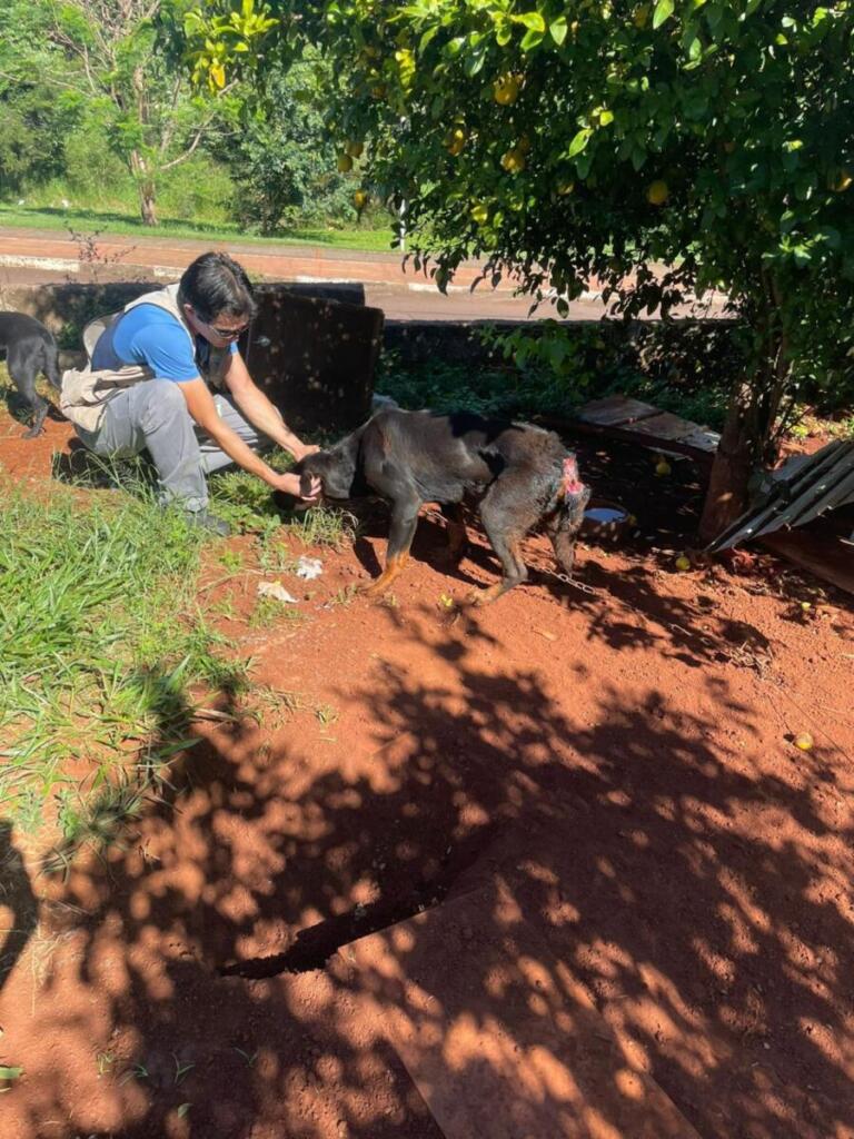 No local foi constatado a veracidade da denúncia: um cachorro, de grande porte, não estava recebendo cuidados e assistência necessária no tratamento de uma doença. Conforme é possível verificar na imagem, o animal estava com uma ferida aberta.