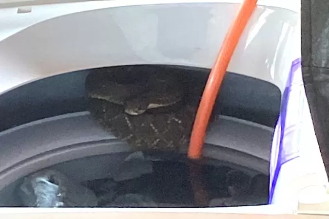 Ao mexer em sua máquina de lavar roupas, ela acabou se deparando com uma cobra cascavel escondida no interior do equipamento. Assustada com a situação, a moradora acionou o Corpo de Bombeiros.