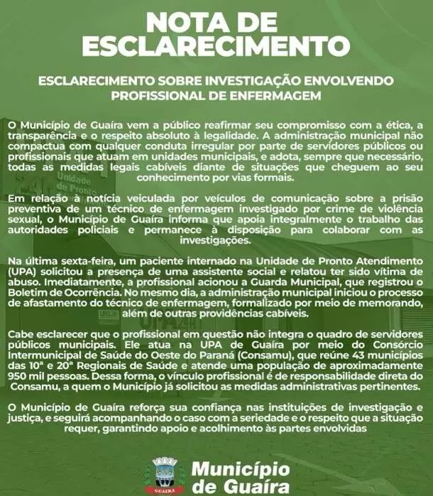 A Prefeitura de Guaíra emitiu uma nota oficial, nesta quinta-feira (23), a respeito de uma investigação envolvendo um profissional de enfermagem.