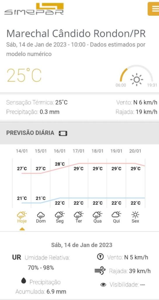 Para Marechal Cândido Rondon, há previsão de pancadas de chuva à tarde. É esperada precipitação acumulada de 6.9 mm. A umidade relativa do ar varia entre 70% e 98%. A temperatura máxima do dia deve alcançar 27 graus.