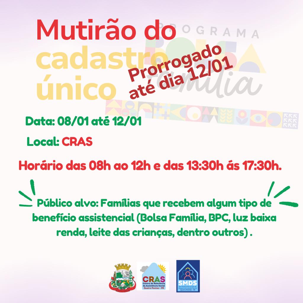 A Prefeitura de Quatro Pontes, através do Centro de Referência de Assistência Social (CRAS) e da Secretaria de Desenvolvimento Social, prorrogou o Mutirão do Cadastro Único até sexta-feira (12).