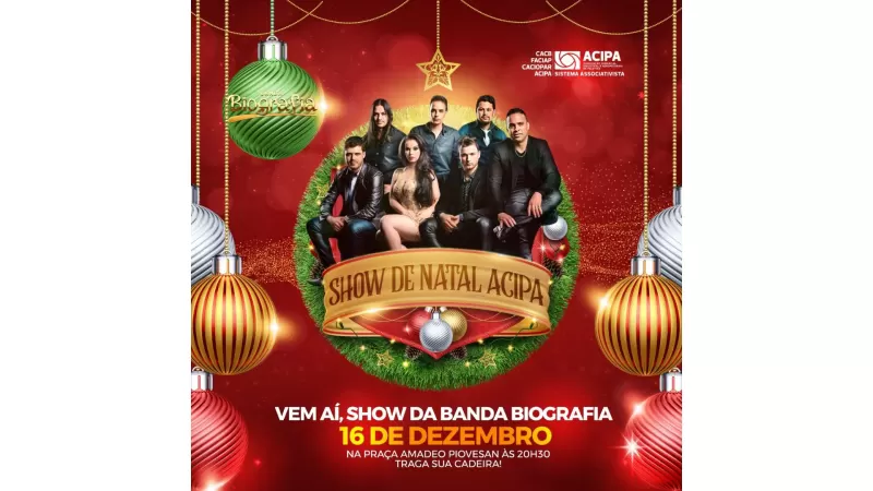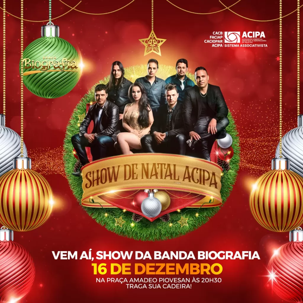 A Praça Amadeo Piovesan será palco de uma noite mágica no dia 16 de dezembro, quando a Associação Comercial, Industrial e Agropecuária de Palotina (ACIPA) realizará o Show de Natal, marcando oficialmente o início da temporada natalina no comércio local. O evento terá início às 20h30, com apresentação da Banda Biografia, trazendo música e animação para toda a família.