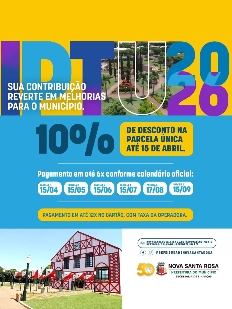 A Prefeitura de Nova Santa Rosa, por meio da Secretaria de Finanças, informa que já está disponível o pagamento do IPTU 2026. Os contribuintes que optarem pela quitação em parcela única até o dia 15 de abril garantem 10% de desconto no valor total do imposto.