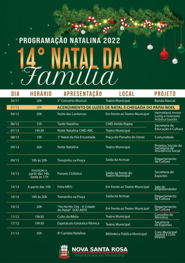 A programação oficial em Nova Santa Rosa inicia neste sábado, dia 26 de novembro, com o 5° Concerto Municipal da Banda Marcial, e encerra somente na quarta-feira, dia 21 de dezembro, com a 8ª Cantata Natalina do Coro Municipal Juvenil e Coro Infantil.
