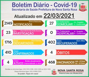 Na segunda-feira (22), Nova Santa Rosa estava com 2.149 casos notificados e testados de Covid-19. Desse total, 410 diagnósticos foram positivados.