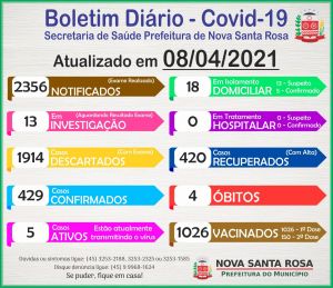 De acordo com o boletim epidemiológico desta quinta-feira (08), Nova Santa Rosa tem o total de 2.356 casos notificados e testados para coronavírus. Desse total, 429 diagnósticos tiveram resultado positivo e 1914 foram descartados com exame.