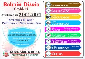 As informações apontam que há nove casos ativos de Covid-19 no município nova santa-rosense, cinco a menos do que constava no boletim epidemiológico de ontem (20). Desse total, três pessoas estão em tratamento hospitalar.
