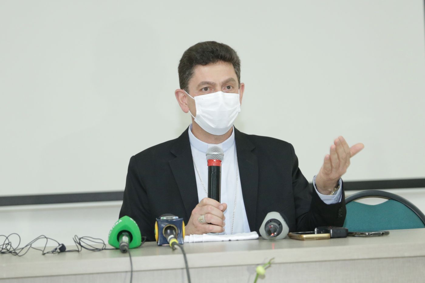 Dom Adelar durante coletiva à imprensa, na segunda-feira (27). Ele assume a condição de chefe da Igreja Católica na Arquidiocese de Cascavel no próximo dia 31: verniz intelectual (Foto: Jorge Pastore)