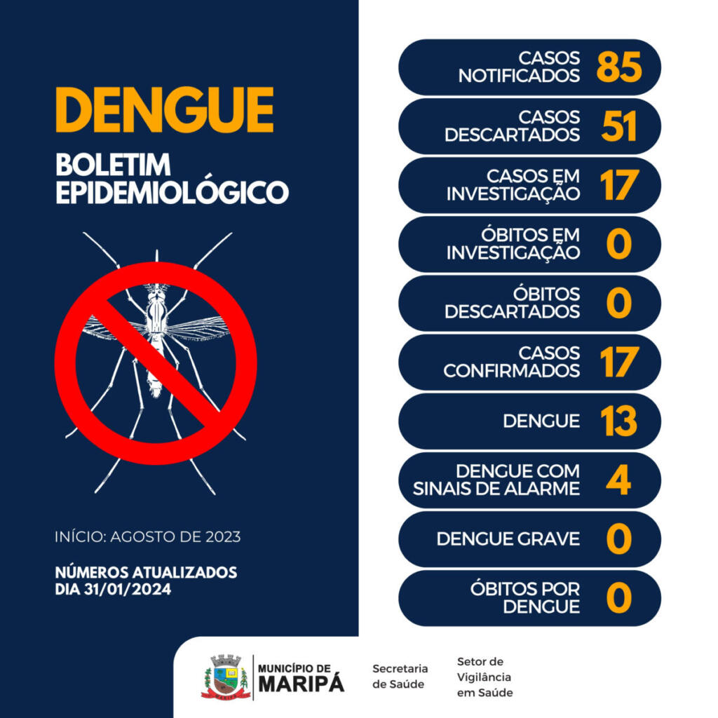 A Secretaria de Saúde de Maripá por meio do Setor de Vigilância em Saúde divulgou, nesta quarta-feira (31), um novo boletim da dengue. São 17 casos confirmados e mais 17 em investigação, números que colocam Maripá em risco de epidemia de dengue.