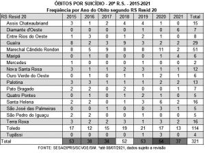 Nos últimos seis anos, a 20ª Regional de Saúde acumulou 321 óbitos por suicídio. Trinta e sete casos de autocídio foram registrados somente nos primeiros sete meses de 2021, número superior ao total de registros em 2016 e 2017. Entre os municípios que compõem a regional, Toledo é o com maior número de casos desde 2015 (114), seguido por Marechal Cândido Rondon (51) e Guaíra (29).