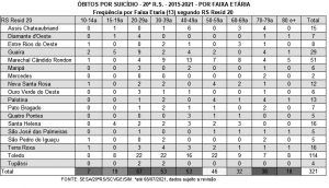 Na 20ª Regional de Saúde, o total de 321 casos de suicídio tem mais casos na faixa etária dos 20 aos 29 anos (57), seguido por pessoas entre 30 e 49 anos (106) e dos 50 aos 59 anos (46).