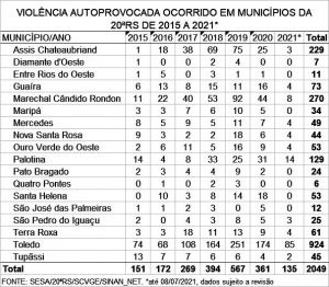 Os municípios que mais acumulam casos de violência autoprovocada na 20ª Regional de Saúde são Toledo (924), Marechal Rondon (270), Assis Chateaubriand (229) e Palotina (129), com um total de 2.049 registros de 2015 a julho de 2021.