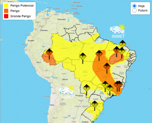O alerta se estende para toda a faixa Sul-Leste e Oeste do Paraná, Santa Catarina e norte do Rio Grande do Sul e tem validade até a manhã de terça-feira (22).