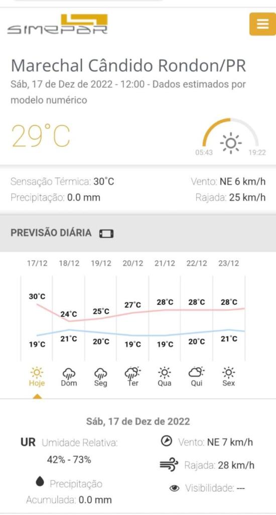 Previsão do tempo para Marechal Rondon, segundo o Simepar: