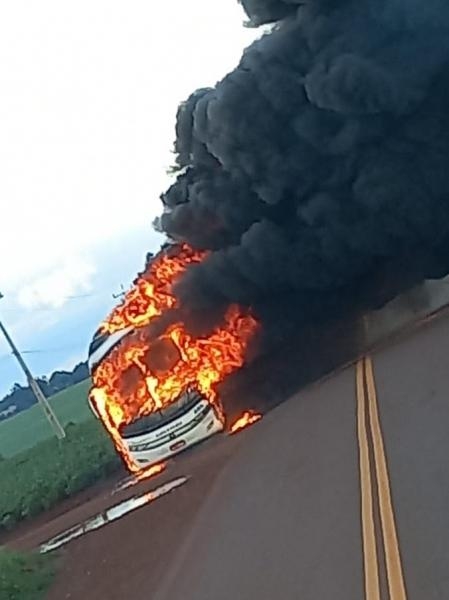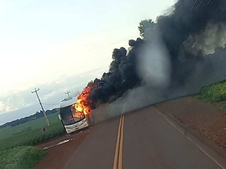 Na tarde desta quarta-feira (25), um ônibus foi tomado pelas chamas na rodovia PR-182, próximo ao distrito de São Camilo, entre Palotina e Terra Roxa.