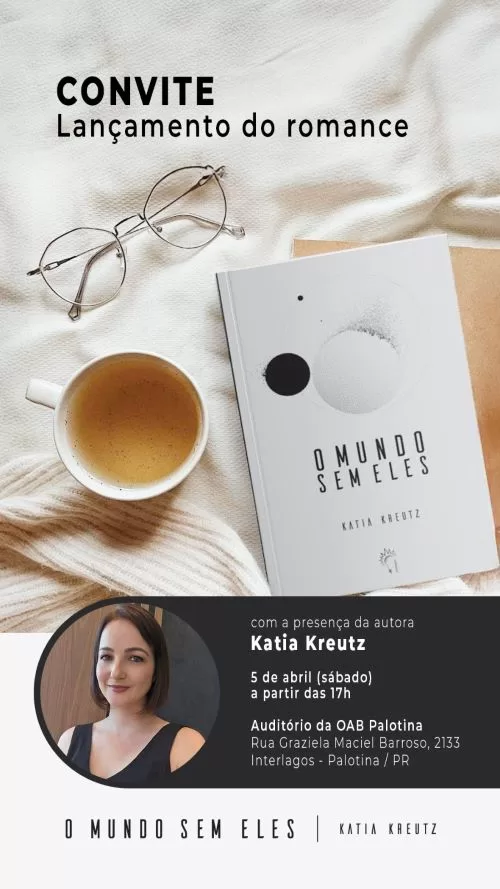 No dia 5 de abril, às 17 horas, no auditório da OAB em Palotina, a autora palotinense Katia Kreutz irá lançar seu romance de ficção científica O Mundo Sem Eles, uma publicação da Editora Litteralux. O evento será aberto e contará com a presença da escritora, autografando os exemplares que podem ser adquiridos no local.