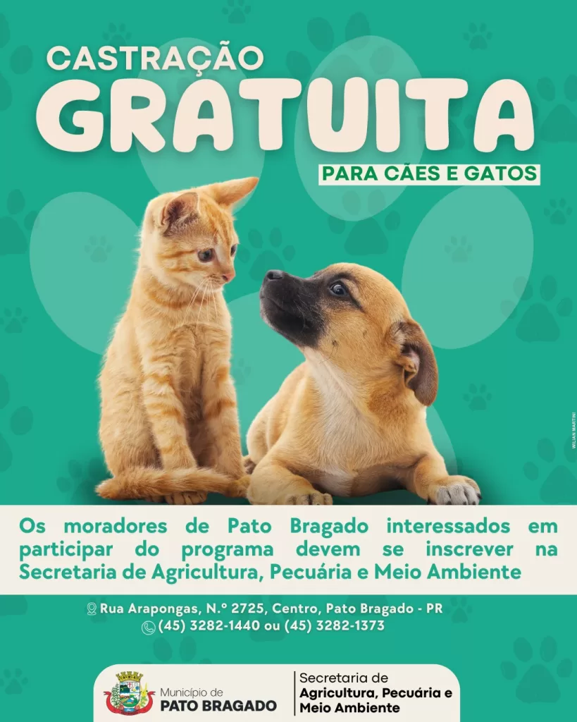 A Secretaria de Agricultura, Pecuária e Meio Ambiente do município de Pato Bragado dá início ao programa de controle populacional de cães e gatos, um projeto de castração que visa promover a saúde e bem-estar dos animais de companhia.