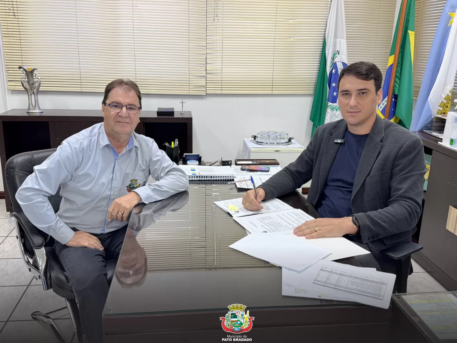 Eles assinaram uma dispensa licitatória que possibilita a contratação de cursos profissionalizantes pelo Senac e Senai. Esta iniciativa visa proporcionar cursos gratuitos ao município de Pato Bragado, fomentando a capacitação profissional dos cidadãos.