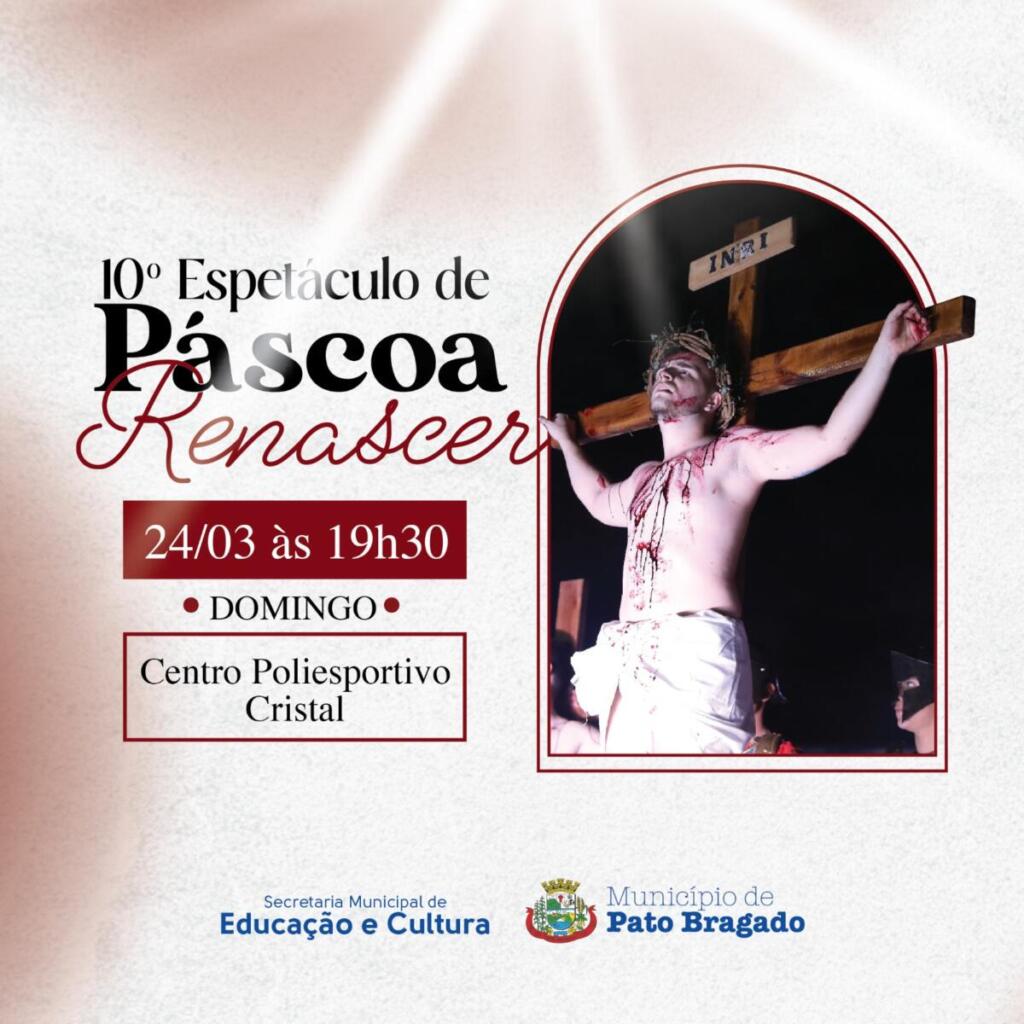 O Espetáculo de Páscoa Renascer chega a sua 10ª edição. Organizado pela administração do prefeito Leomar Rohden, o Mano e vice John Nodari de Pato Bragado, por intermédio da Secretaria de Educação e Cultura será realizado no domingo (24), a partir das 19h30, no Centro Poliesportivo Cristal.