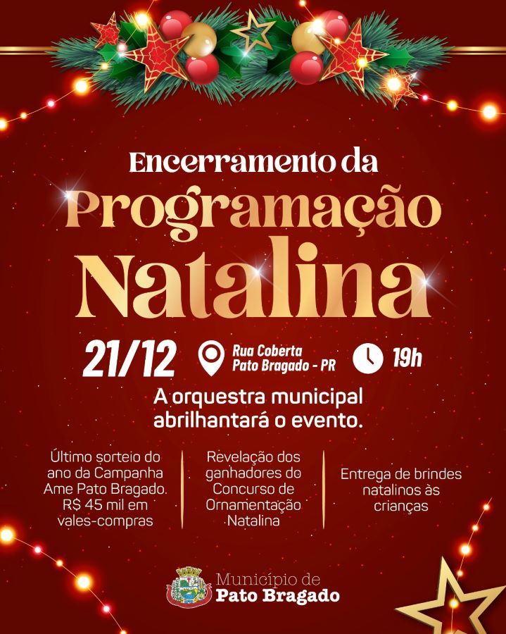 O roteiro de atividades natalinas promovidas pela administração do prefeito de Pato Bragado, Leomar Rohden, o Mano, vice John Nodari encerra na quinta-feira (21), na Rua Coberta, com três importantes momentos. A partir das 19 horas, a Secretaria de Indústria, Comércio, Turismo e Desenvolvimento Econômico realizará o último sorteio da Campanha Ame Pato Bragado. Serão R$ 45 mil em vales-compras para os consumidores e empresas.
