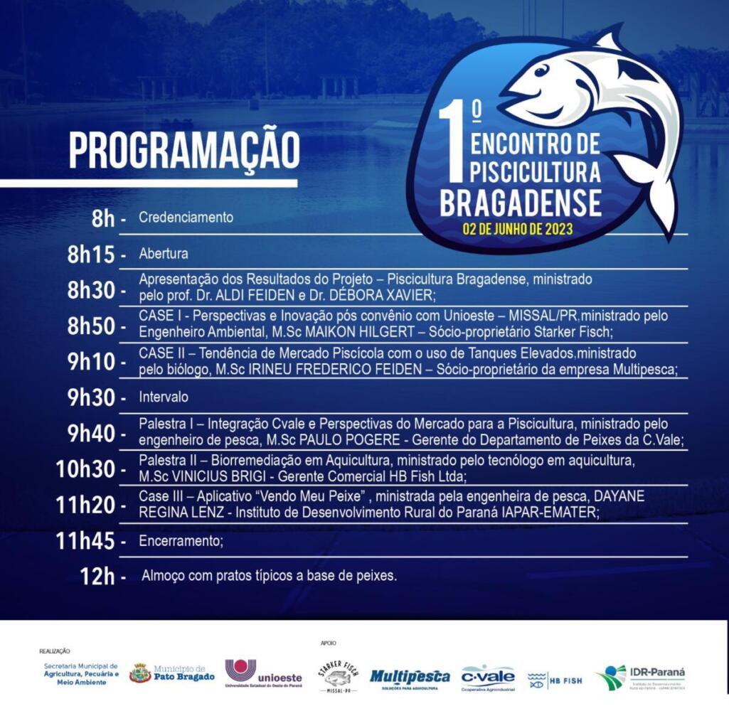 Organizado pela Secretaria de Agricultura, Pecuária e Meio Ambiente de Pato Bragado por meio de convênio de Cooperação Técnica e Científica entre o Município e o curso de Engenharia de Pesca da Unioeste, Campus de Toledo, o encontro contará com profissionais de renome regional e nacional.