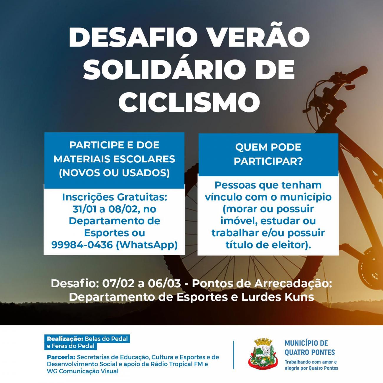 Termina hoje (08) o período de inscrições ao Desafio Verão Solidário de Ciclismo de Quatro Pontes, organizado pelos grupos Belas do Pedal e Feras do Pedal, em parceria com a Secretaria de Educação, Cultura e Esportes, por intermédio do Departamento de Esportes, e a Secretaria de Desenvolvimento Social, com o apoio da Rádio Tropical FM e a WG Comunicação Visual.