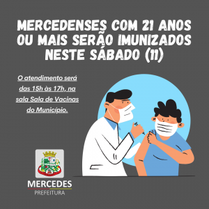 A Secretaria de Saúde de Mercedes dará sequência ao cronograma de imunização contra a Covid-19. Nesta sábado, dia 11, serão imunizadas pessoas com 21 anos ou mais. O atendimento será das 15 horas às 17 horas, na sala em anexo a Academia da Saúde, localizada ao lado do CRAS.