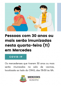 A Secretaria de Saúde de Mercedes dará sequência ao cronograma de imunização contra a Covid-19. Nesta quarta-feira (11), serão imunizadas pessoas com 30 anos ou mais. O atendimento será das 13h30 às 16 horas, na sala em anexo a Academia da Saúde, localizada ao lado do CRAS.