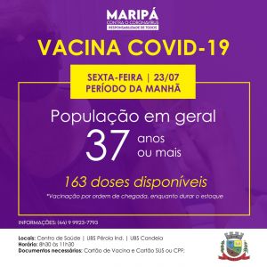 Com a chegada da 31ª remessa de vacinas contra a Covid-19, o Município de Maripá irá vacinar nesta sexta-feira (23), no período da manhã, a população em geral com 37 anos ou mais. O novo lote contém 163 doses para a aplicação da 1ª dose, divididas entre as fabricantes AstraZeneca, AstraZeneca/Covax, Coronavac e Pfizer.