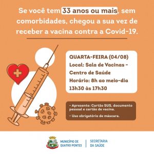 A vacinação contra a Covid-19 no município de Quatro Pontes alcança uma nova faixa etária nesta quarta-feira (04). A Secretaria de Saúde do município deve vacinar pessoas de 33 anos ou mais sem comorbidades. Quatropontenses que se encaixam neste grupo precisam procurar a Sala de Vacinas, no Centro de Saúde, das 08 horas ao meio-dia ou das 13h30 às 17h30.