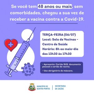 Amanhã (06), a Secretaria de Saúde de Quatro Pontes dará continuidade à vacinação contra a Covid-19, contemplando as pessoas de 48 anos ou mais sem comorbidades. Esses munícipes devem procurar a Sala de Vacinas, no Centro de Saúde, onde precisam apresentar o Cartão SUS, documento pessoal e a carteira de vacinas para tomar a dose. Além disso, é obrigatório o uso de máscara, podendo ser dispensado se estiver sem a mesma. O horário de atendimento é das 08 horas ao meio-dia e das 13h30 às 17h30.
