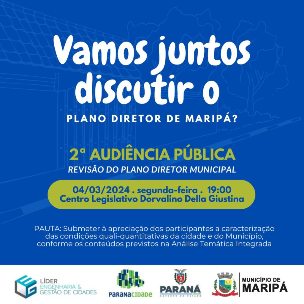 O Governo Municipal de Maripá convoca todos os maripaenses para participarem da 2ª audiência pública da Revisão do Plano Diretor Municipal (PDM). A audiência vai ocorrer no dia 4 de março, às 19 horas, no Centro Legislativo Dorvalino Della Giustina.