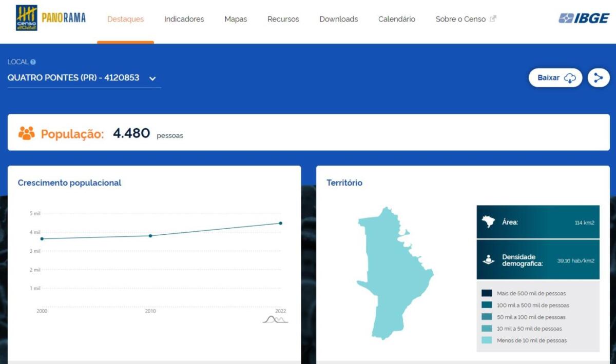 Os primeiros resultados consolidados do Censo Demográfico de 2022 divulgados nesta quarta-feira (28) pelo Instituto Brasileiro de Geografia e Estatística (IBGE) apontam que em 12 anos Quatro Pontes ganhou 677 novos residentes, passando de 3.803 no Censo de 2010 para 4.480 pessoas no estudo mais recente. O crescimento da população foi, então, de 17,8% no período.